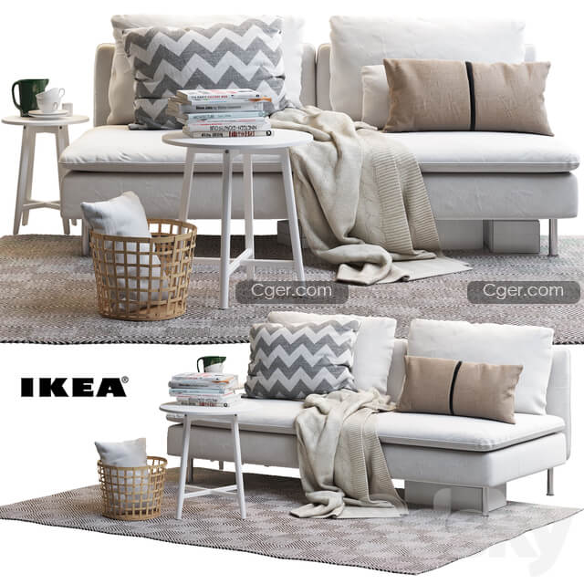 ikea, soderhamn, kragsta, sail, rug, sofa, carpet, pillows, plaid, coffee table, books, armchair, boxes, jug, cups, basket