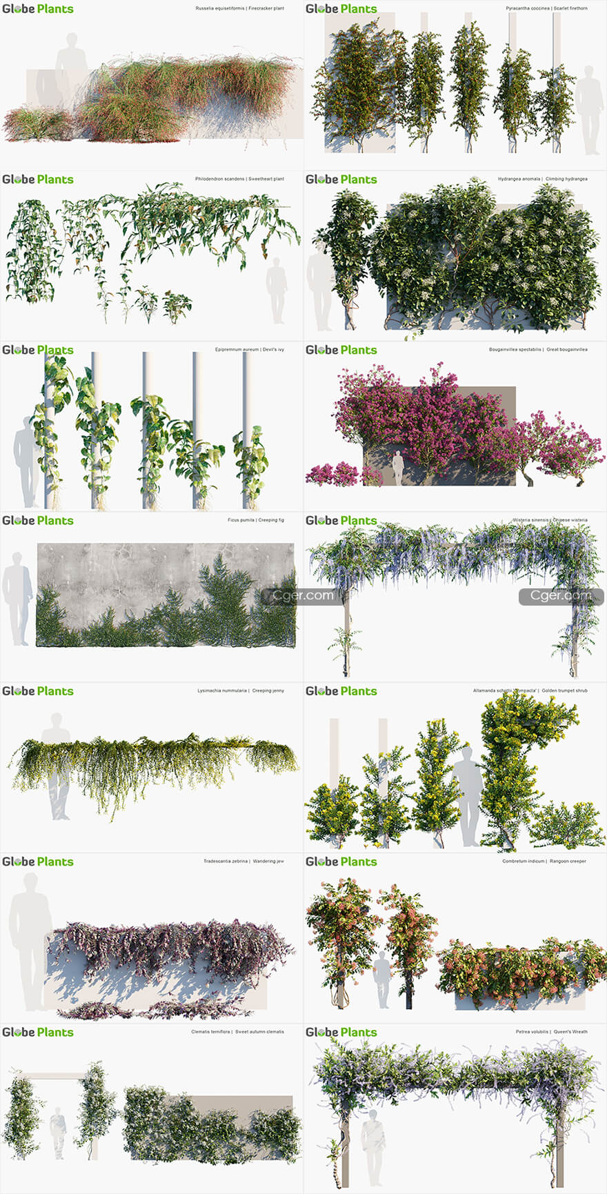 Globe Plants 植物模型第六期包括15种常见的藤蔓植物和攀援植物,以及80多种独特的模型,这些模型具有多种形式,可用于您的许多场景。使用MESH、BLENDER、C4D和SKETCHUP格式,您只需拖放即可渲染,使用GrowFX格式,您可以获得最大的灵活性来编辑植物。