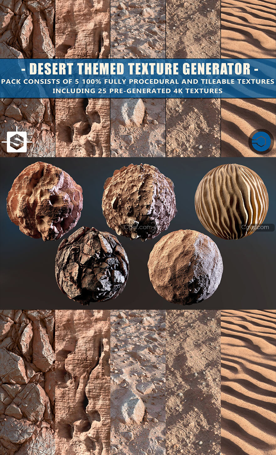 This highly detailed, fully procedural, tileable desert environment texture generator pack, is ready to be tweaked for your needs with Substance Player.