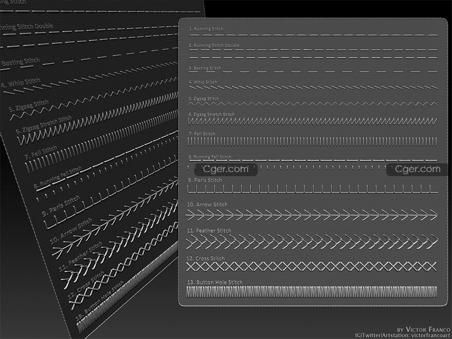 Hello, in this pack you will find 13 custom IMM curve brushes of real stitching techniques, to use on Zbrush, totally free!