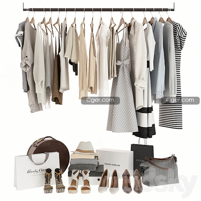 一组衣服服装模型,运动夹克,衬衫,连衣裙,衬衫,裤子,鞋子,包,手提箱,箱子,公文包,毛衣,鞋类。
