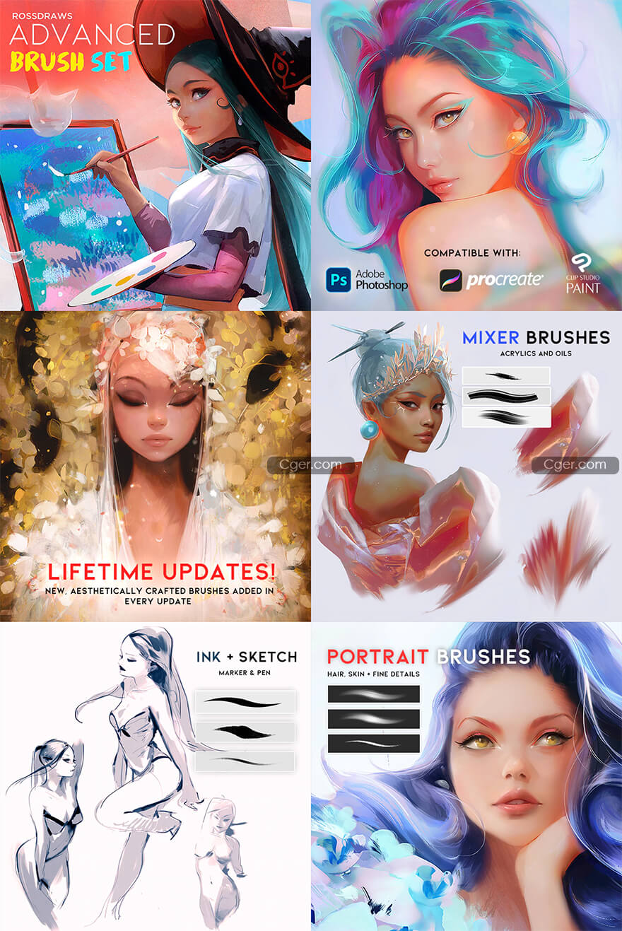 Ross Draws高级画笔包包含30个画笔和一个关于如何使用每个画笔的视频演示。