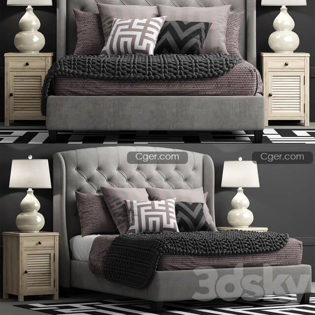 拱形双人床模型,床头柜,葫芦形台灯模型。