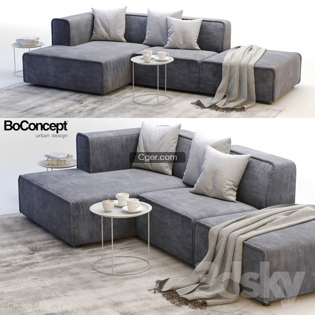 boconcept, sofa, angular, carpet, plaid, pillows, table, cups, books, candle