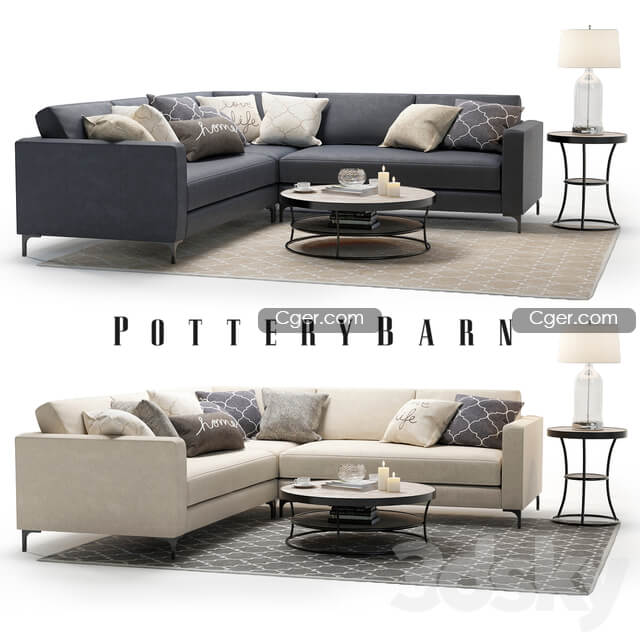 Pottery Barn沙发模型套装,茶几,地毯,小圆桌,台灯模型。