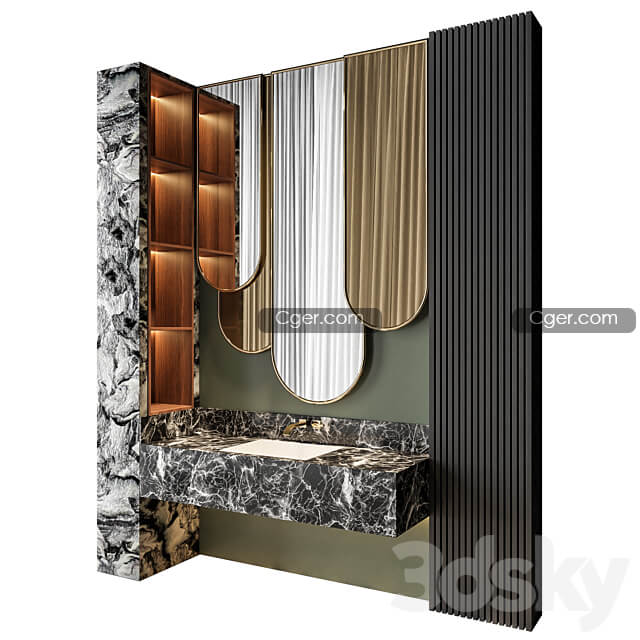 豪华浴室模型,水槽、洗脸盆、面盆、水龙头,格子柜子,镜子模型。