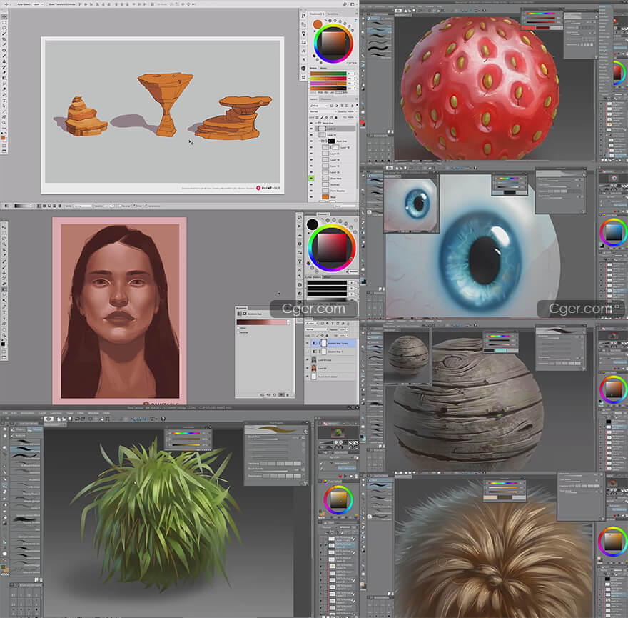 Paintable - 数字绘画学院-额外教程,石头,草莓,头发,眼球,木材,毛发,草的绘画教程。