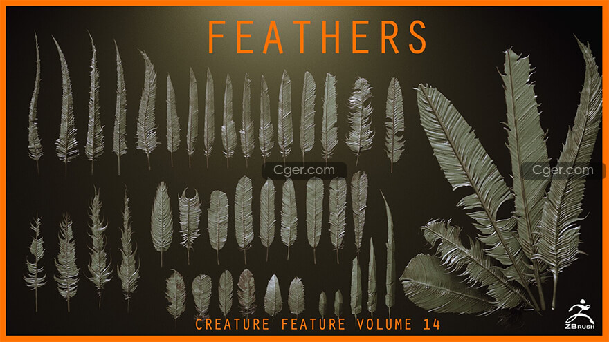40个高精度的羽毛模型和zbrush笔刷,超级节省工作时间 - 快速为3D雕刻/设计/概念增添趣味。