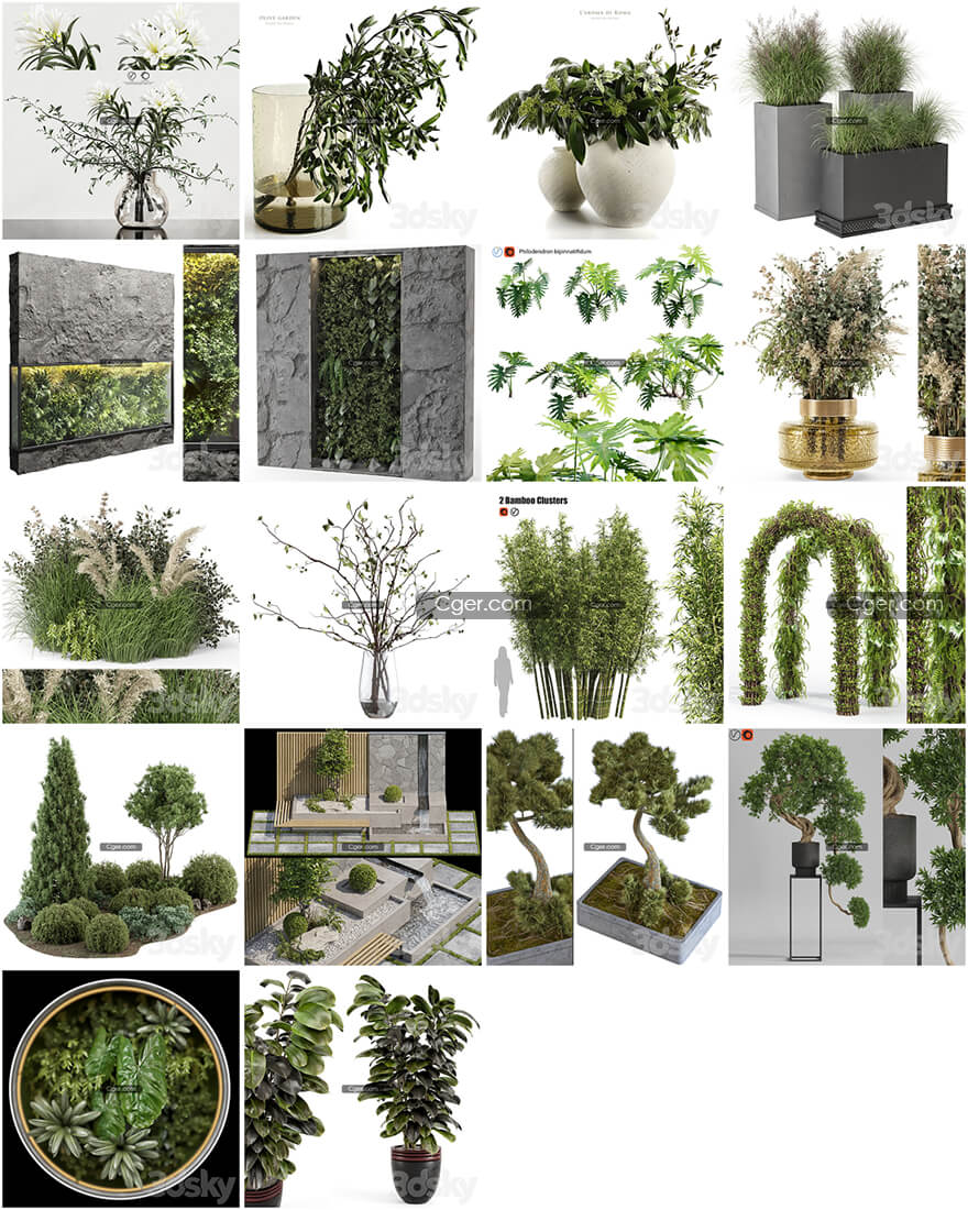 18套3dsky网站的花瓶,花盆,盆栽,墙面绿化,植物,盆景模型合集。