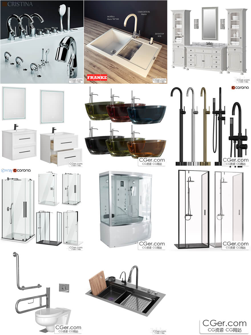 11 套3dsky网站的厨卫家具五金模型,水龙头,洗手池,卫生间柜子,浴缸,淋浴盆,马桶等模型。