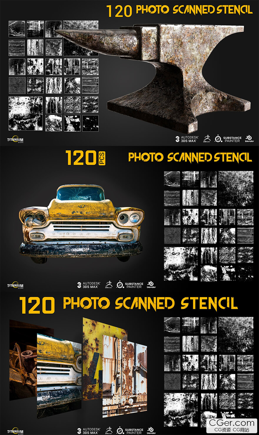 120+ stencil black and white mask that allows you to create every imperfection on any surface in substance painter and also in any 3d software you can use these for create advance blended texture