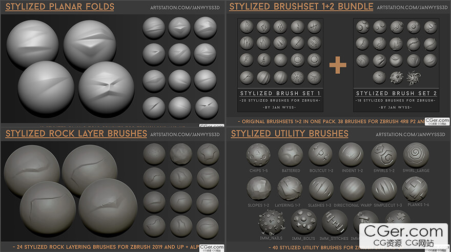 Artstation - 扬·怀斯的风格化Zbrush 画笔合集 + 阿尔法贴图,psd和zbp格式。