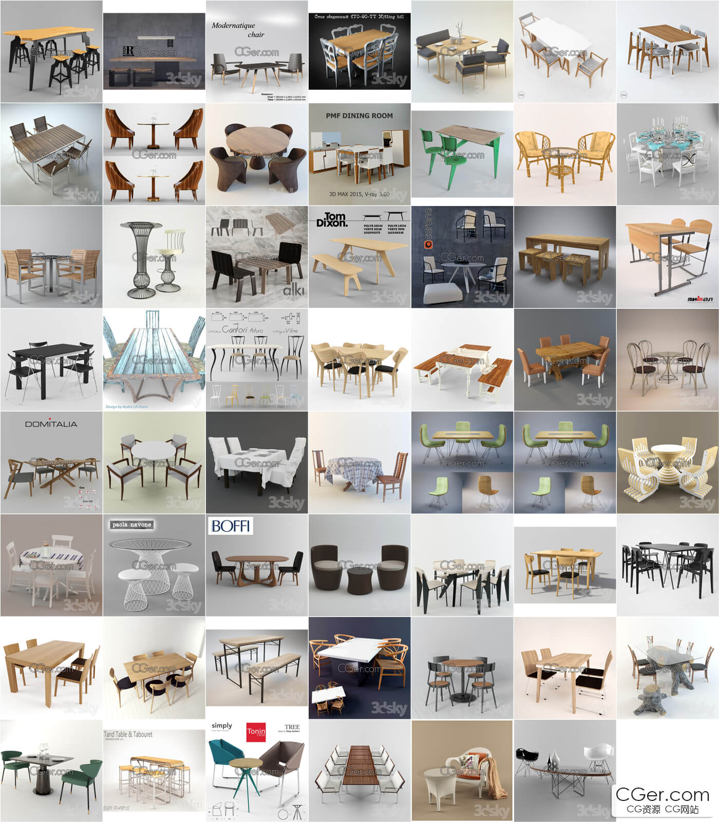 55套3dsky网站的桌椅组合模型,餐桌,餐椅,茶几,休息椅,圆桌,木板桌椅,会客桌椅,平板餐桌, 长凳,藤椅和桌子,高科技风格的桌椅等模型。