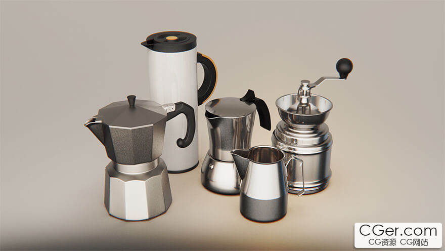 摩卡咖啡套装3D模型,咖啡壶,咖啡杯,手冲壶,磨碎器,fbx格式。作者:米兰米连科维奇