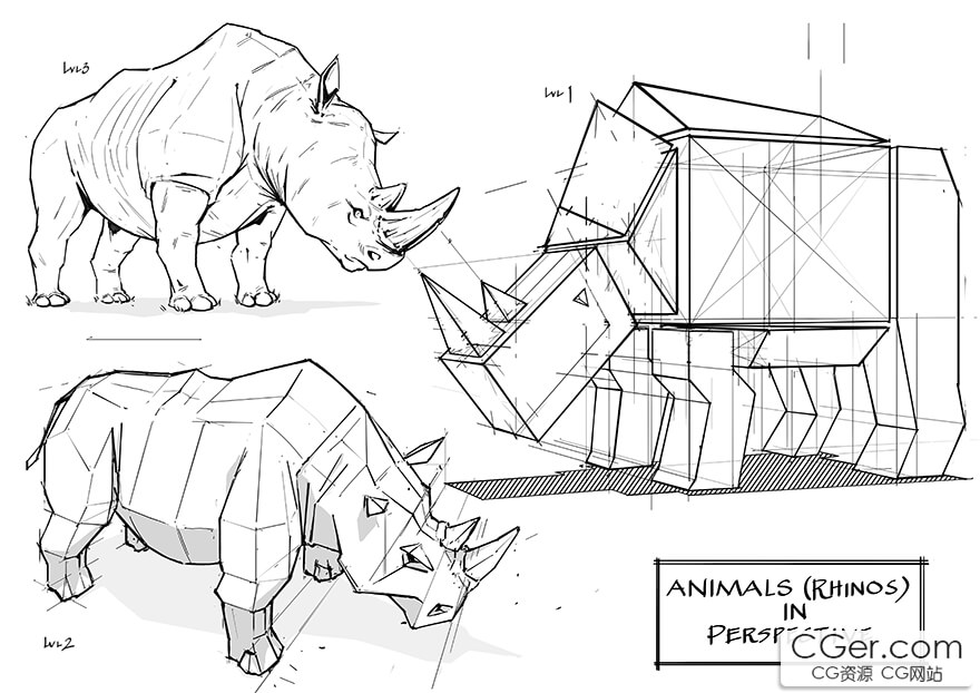 Foundation Sketching - 绘制透视动物(犀牛)教程,作者:查尔斯·林