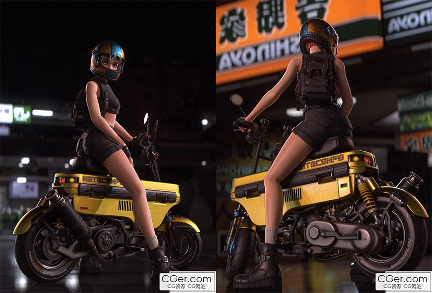 定制本田摩托康波滑板摩托车模型,包括背着背包的女孩角色模型,max fbx obj格式。