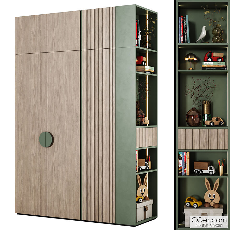 儿童房模块化衣柜模型,前部是直的,带有圆形手柄,橱柜的末端有一个带有装饰的开放式架子,架子里有装饰品玩具模型。
