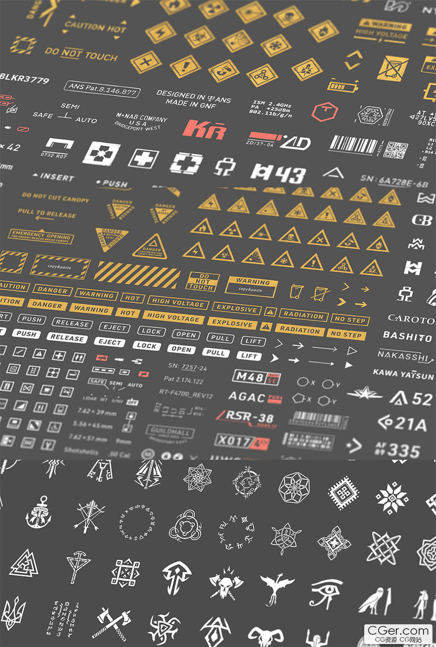 warning signs, logotypes, marks, product names, manufacturing decals, prop and weapon decals, arrows, navigation icons, military call signs, electronic decals and barcodes.