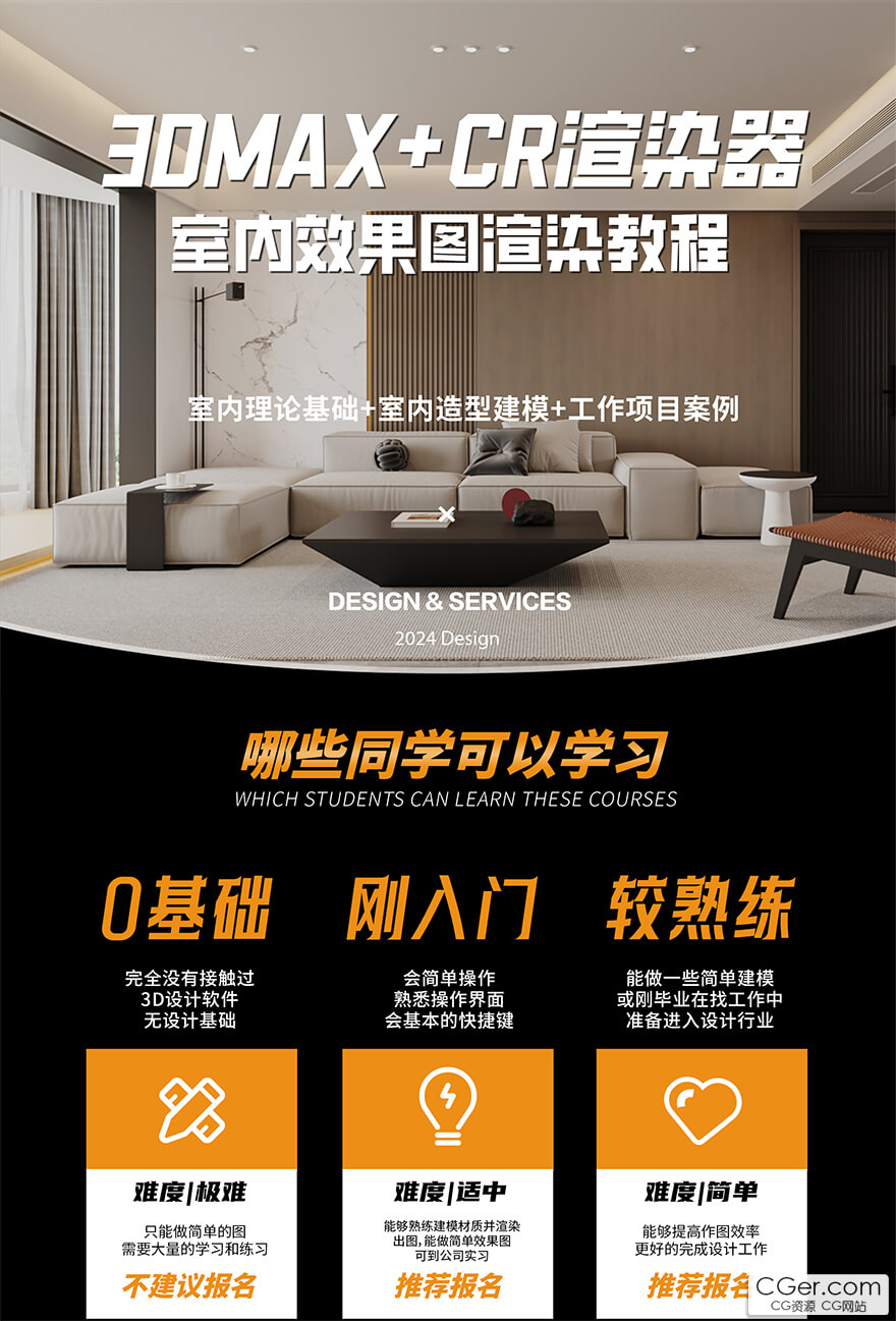 本套教程是由实际项目要求开发的教程,是讲师在实际工作当中挑选的案例,一共有两套案例,第一套案例是现代风格有详细的资料,第二套案例是黑白灰风格,我们经常遇到客户没有资料,只发参考,进行制作,这套教程将教会学员从前期的比如说刚入行的了解室内的一个基本的常识,然后从跟客户沟通,资料的整理,建模,材质,灯光,后期然后到合成的全流程的一个教程。