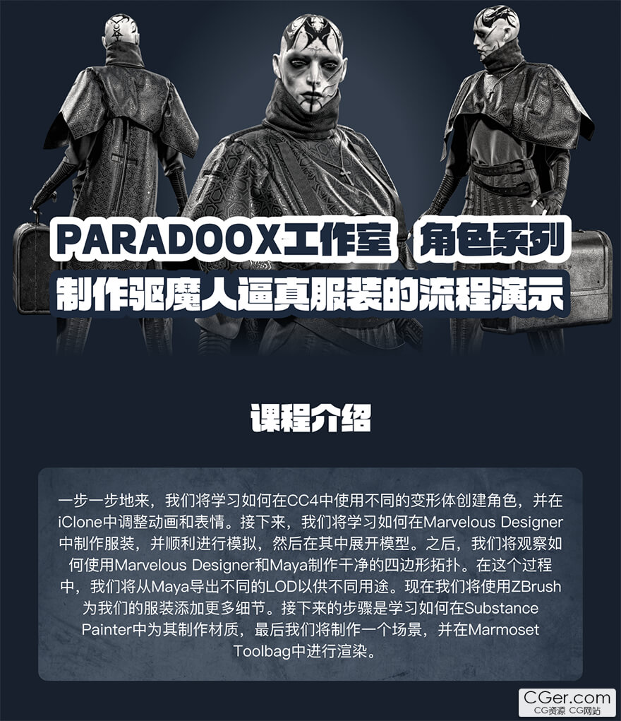 一步一步地来,我们将学习如何在CC4中使用不同的变形体创建角色,并在iClone中调整动画和表情。接下来,我们将学习如何在Marvelous Designer中制作服装,并顺利进行模拟,然后在其中展开模型。之后,我们将观察如何使用Marvelous Designer和Maya制作干净的四边形拓扑。在这个过程中,我们将从Maya导出不同的LOD以供不同用途。现在我们将使用ZBrush为我们的服装添加更多细节。接下来的步骤是学习如何在Substance Painter中为其制作材质,最后我们将制作一个场景,并在Marmoset Toolbag中进行渲染。