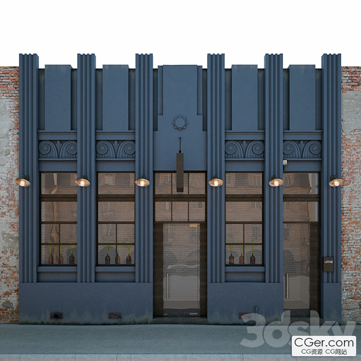 这栋建筑外观现代,外墙是深蓝色,显得稳重而大气。建筑正面有几根装饰性的竖直柱子,增添了立体感。窗户设计精巧,上方有装饰图案,窗台上摆放着绿植,为建筑增添了一抹生机。入口处是透明的玻璃门,显得明亮通透,门上方悬挂的灯具则增添了温馨的氛围。