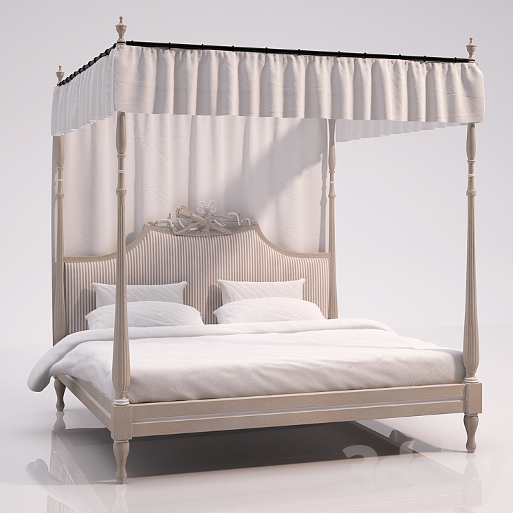This image displays an elegant four-poster bed, with crisp white sheets and pillows laid neatly on it. Above the headboard, there is an ornate carved decoration, adding a touch of classical charm. A white curtain hangs at the top of the bed, complementing the bedding below. Four posts firmly support the canopy, creating a beautiful and functional design overall.