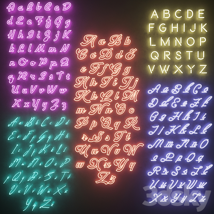 This picture displays neon light effects of English letters in three colors. On the left is a purple neon light, showcasing both uppercase and lowercase English letters; in the middle is a red neon light, also containing uppercase and lowercase letters; and on the right is a blue neon light, presenting uppercase and lowercase letter styles as well. Each color of neon light makes the letters appear dazzling.