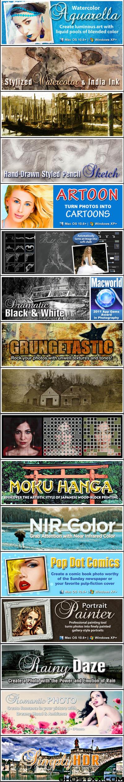 For maximum savings and convenience, the Premium Pack bundles 18 incredible creative apps into one powerful package: Aquarella, Artista Haiku, Artista Oil, Artista Sketch, Artoon, Chalkspiration, Dramatic Black&White, Grungetastic, Kyoobik Photo, Moku Hanga, NIR Color, Pop Dot Comics, Portrait Painter, Rainy Daze, Romantic Photo, Simply HDR, Snow Daze and Vintage Scene. The Premium Pack comes wrapped together for convenience — one application, one installer, one interface, and a plugin for Photoshop, Elements, Lightroom and PaintShop Pro.
